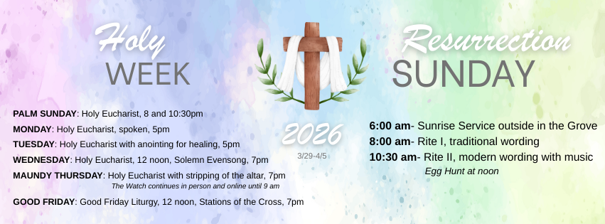 - 8:00 a.m. – Holy Eucharist, Rite I spoken, in-person and online at YouTube